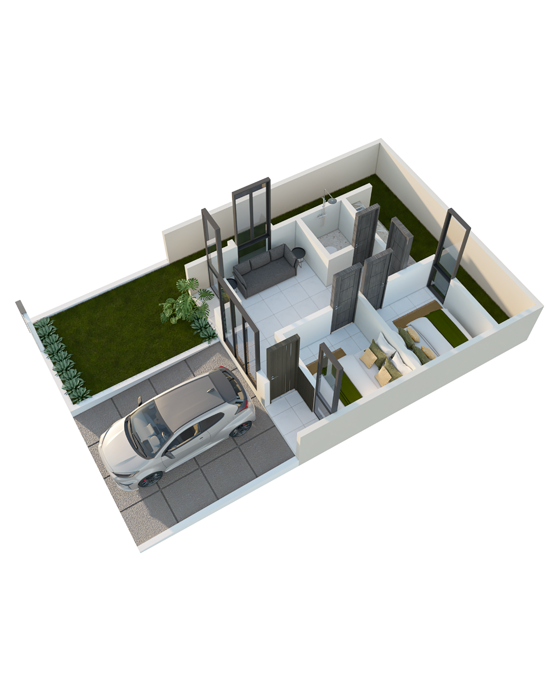 Kusen: Aluminium. Pintu Utama: Panel Engineering. Pintu Kamar: Taewood. Pintu Kamar Mandi: PVC. Lantai: Geranite Tile 60x60